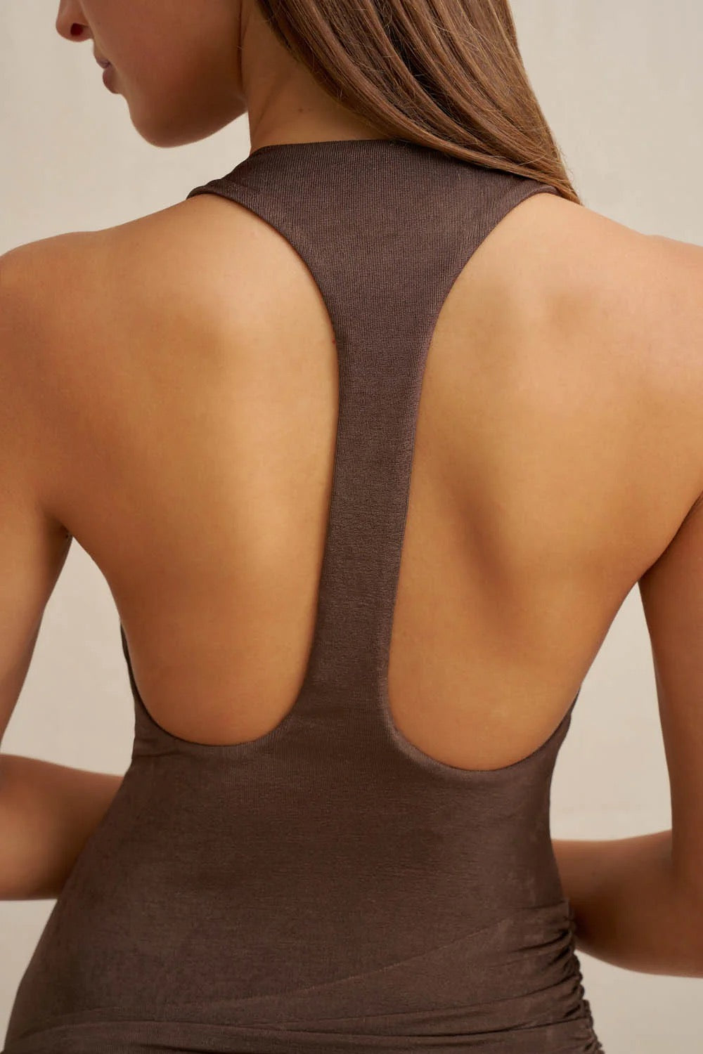 Made from a high stretch, soft buttery jersey fabric which has a slight sheen. Featuring a hand draped twist panel across the hip.