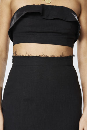 - Cropped, fitted bustier style with frilled overlay panel