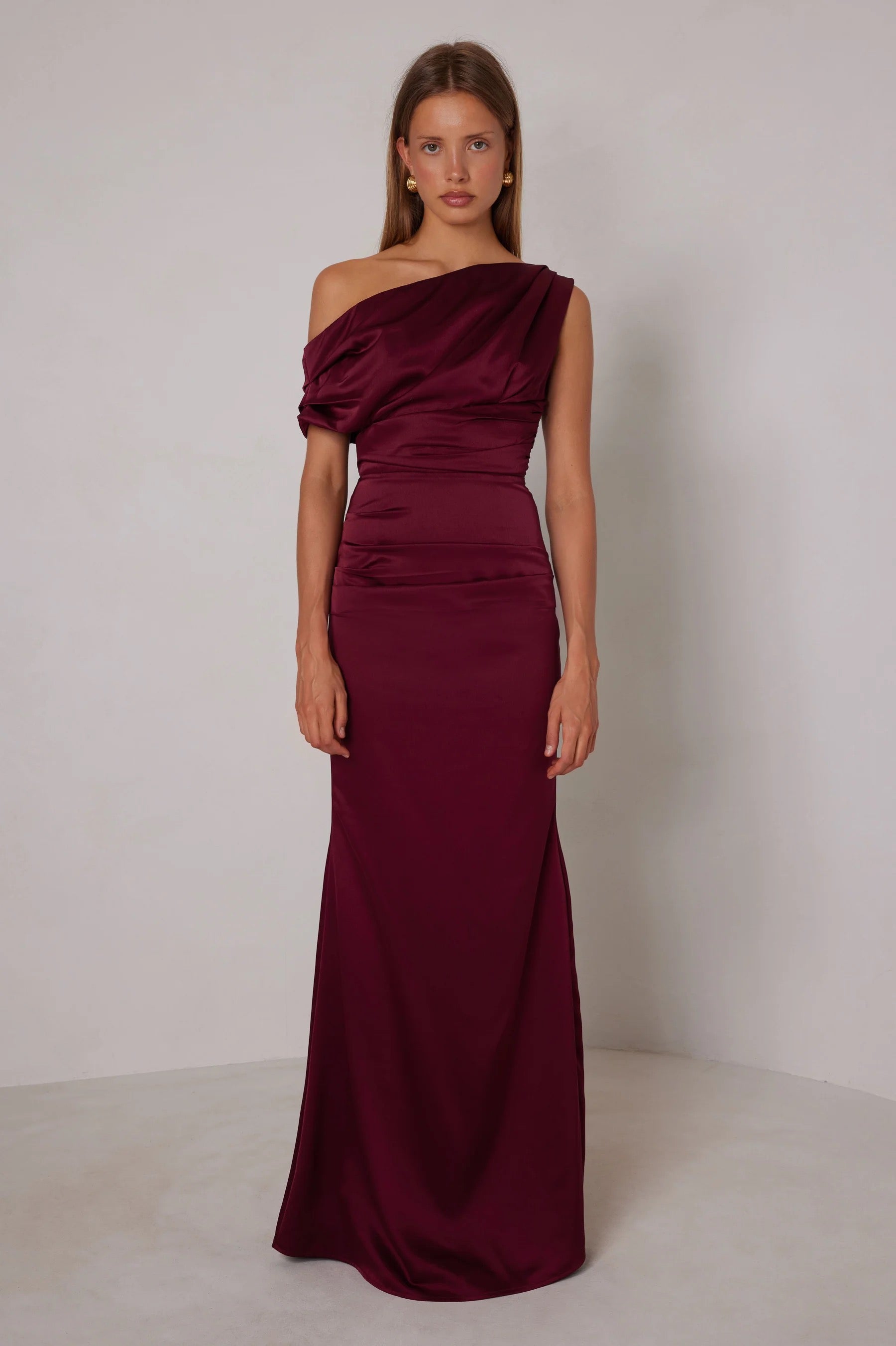 The dress is a stunning satin featuring a sleek, form-fitting silhouette that elegantly hugs the body. It has a unique one-shoulder design, with the fabric draping beautifully across the shoulder and creating a soft, gathered effect.