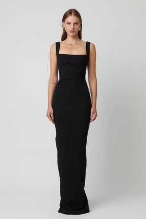 Our Marbella gown has a flattering bustier-inspired bodice with a square neckline that peeks out from underneath the draped detailing. It's cut from black crepe and has a slim fit with a seamed waist and back split for ease of movement. Style it with embellished sandals.