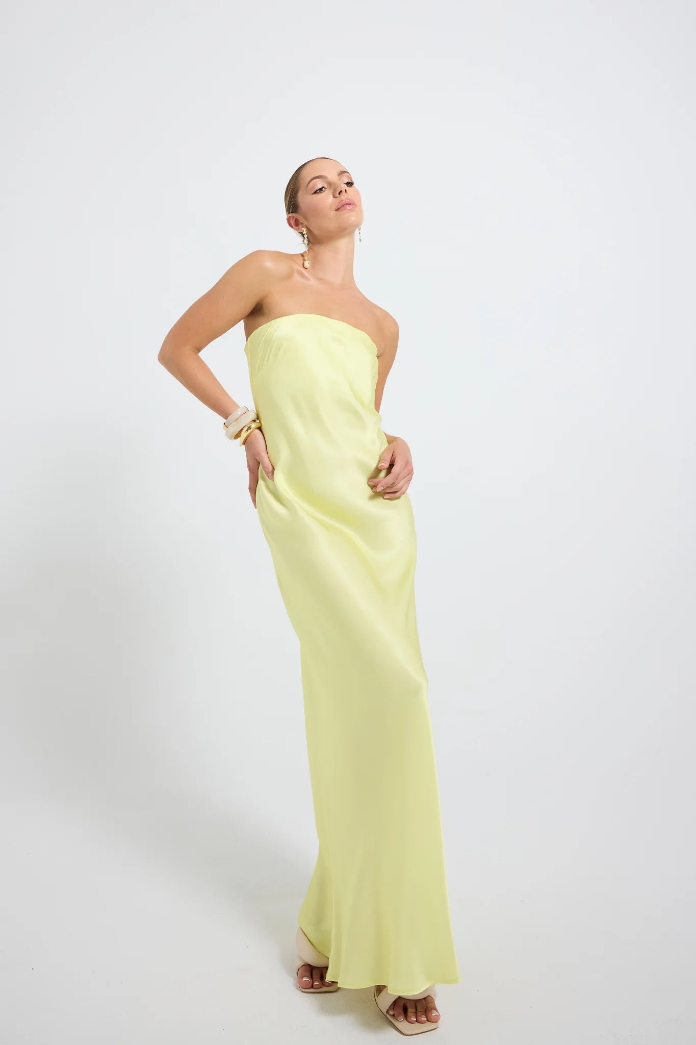 The Quinn Strapless Maxi by PASDUCHAS is a sleek, statement silhouette crafted from lustrous satin. Cut on the bias for a fluid, flattering drape, the design features a strapless neckline secured with elastic for a comfortable fit. A removable scarf tie adds versatility, wear it elegantly at the neck or styled around the waist to define your shape. Falling to a full maxi-length hem and finished with an invisible centre-back zipper, this piece is perfect for modern event dressing.