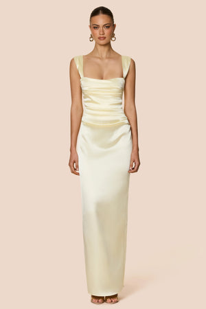 Timeless and unforgettable. The Dream Satin Gown features a fitted and boned bodice, wide adjustable straps and striking column silhouette. Designed to turn heads and elevate every entrance—this is glamour, redefined.