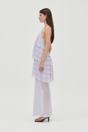 The Gaia Dress is a refined statement in sheer chiffon, featuring a halter-neck and open back for a clean, elongated silhouette. Cascading tiers through the bodice add soft volume and fluidity, enhanced by the fabric’s subtle ripple texture that brings depth and dimension.
