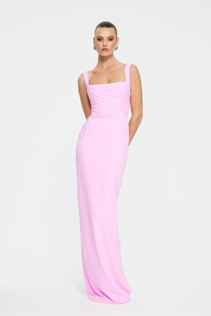 Our Marbella gown has a flattering bustier-inspired bodice with a square neckline that peeks out from underneath the draped detailing. It's cut from black black crepe and has a slim fit with a seamed waist and back split for ease of movement. Style it with embellished sandals.