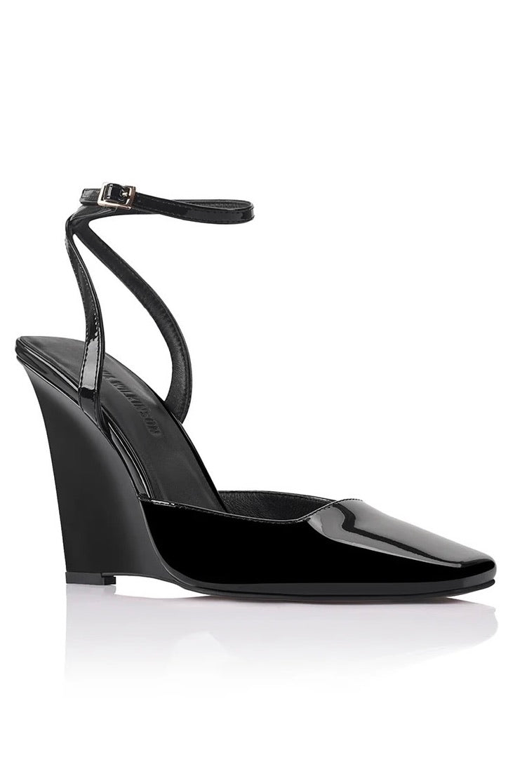 Mona is a refined wedge with a sleek, sculptural edge. Now available in classic black patent leather, this pointed-toe design features a high-cut vamp and a slim ankle strap for a structured, elegant finish. The angled wedge heel adds modern elevation while offering all-day support—making Mona a versatile staple for both polished daytime looks and elevated eveningwear.