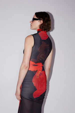 Sleeveless fitted mesh dress with gathers on side, flared bottom, high slit and asymmetric hemline.