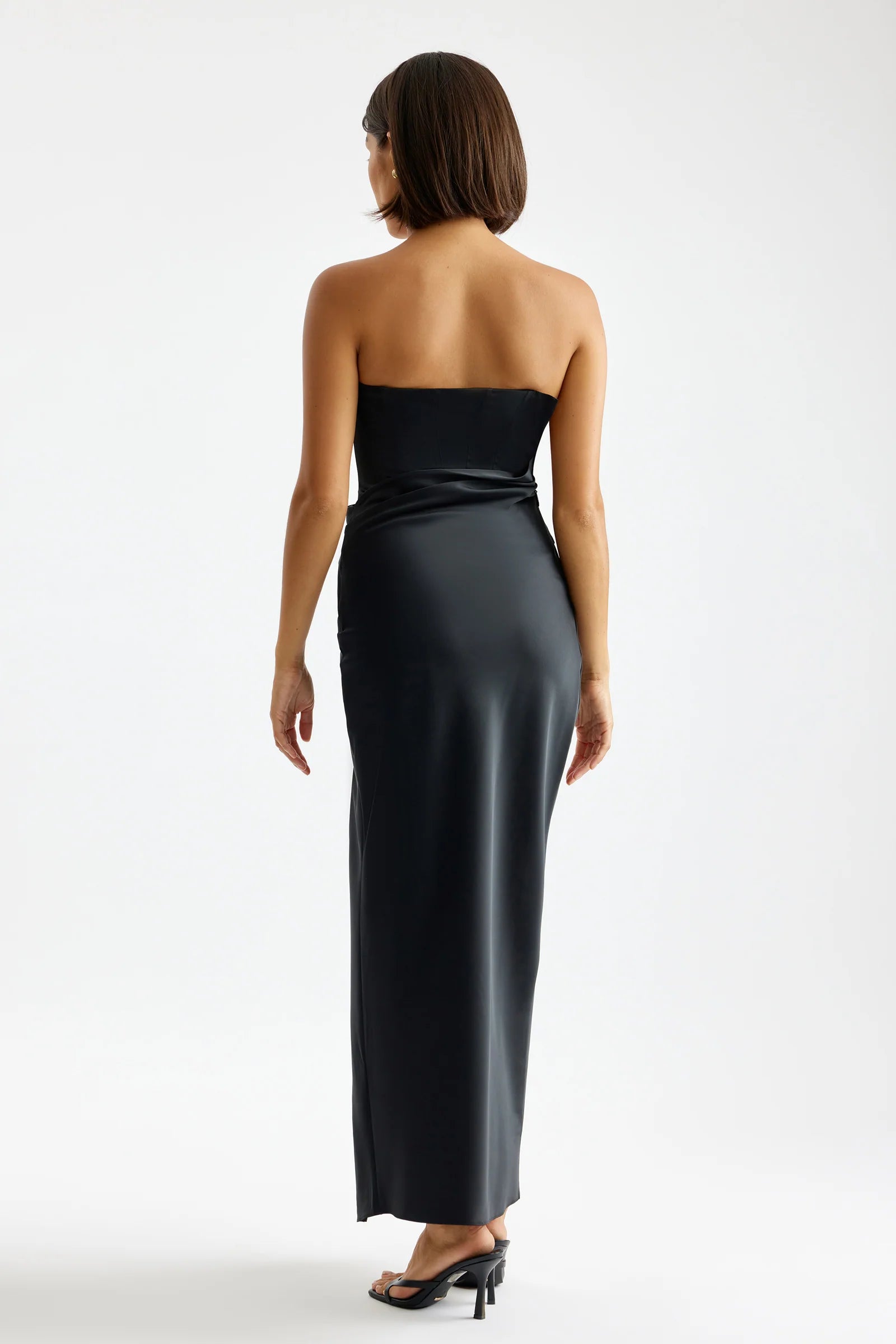 The Kaia Dress is cut from lustrous satin and features a structured, boned bodice with a strapless neckline for a sculpted fit. A layover wrap skirt design creates a thigh-high split, with soft tucks across the stomach for a flattering finish.