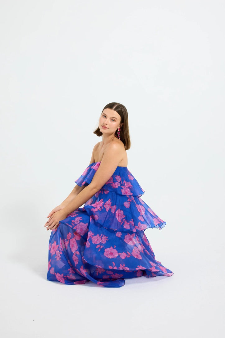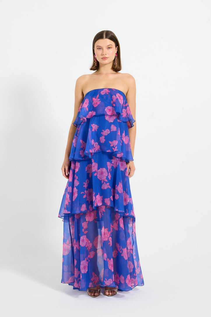 The Esme Tiered Maxi by PASDUCHAS is crafted from soft-touch organza, featuring an exclusive floral print. A square-cut strapless neckline anchors the design, while multi-layered tiers create soft volume that falls to a full maxi-length hem, offering a romantic and ethereal silhouette. An invisible zipper at the centre back allows for ease of fit and wear, making this a graceful option for special occasions or warm-weather celebrations.