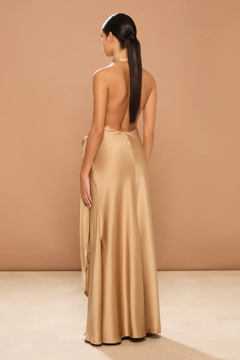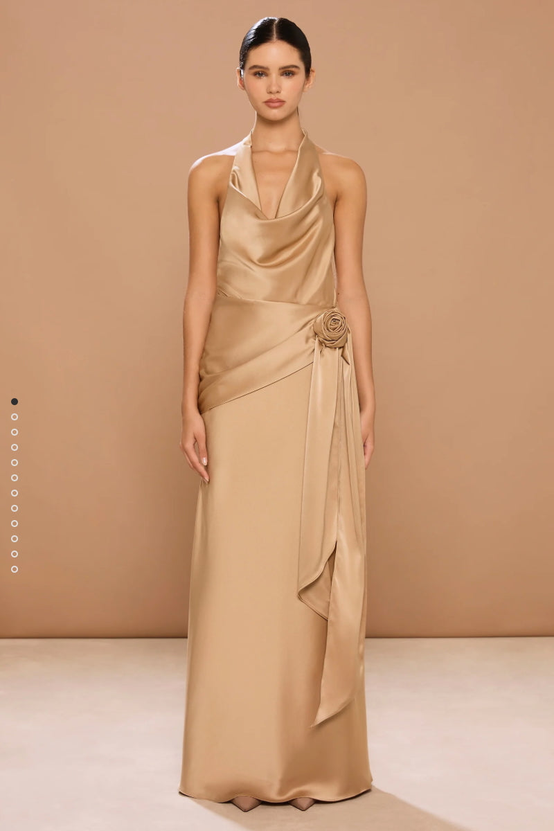 The Rozalia Dress is an ode to modern elegance, crafted in a lustrous satin finish that glides effortlessly over the body. A fluid cowl neckline frames the décolletage with soft draping, while the floor-length silhouette is cinched at the waist with a sculpted band, gathered into a delicate rose detail that cascades into layered folds. The back reveals a graceful scoop cut, secured at the nape with a discreet hook-and-eye closure.