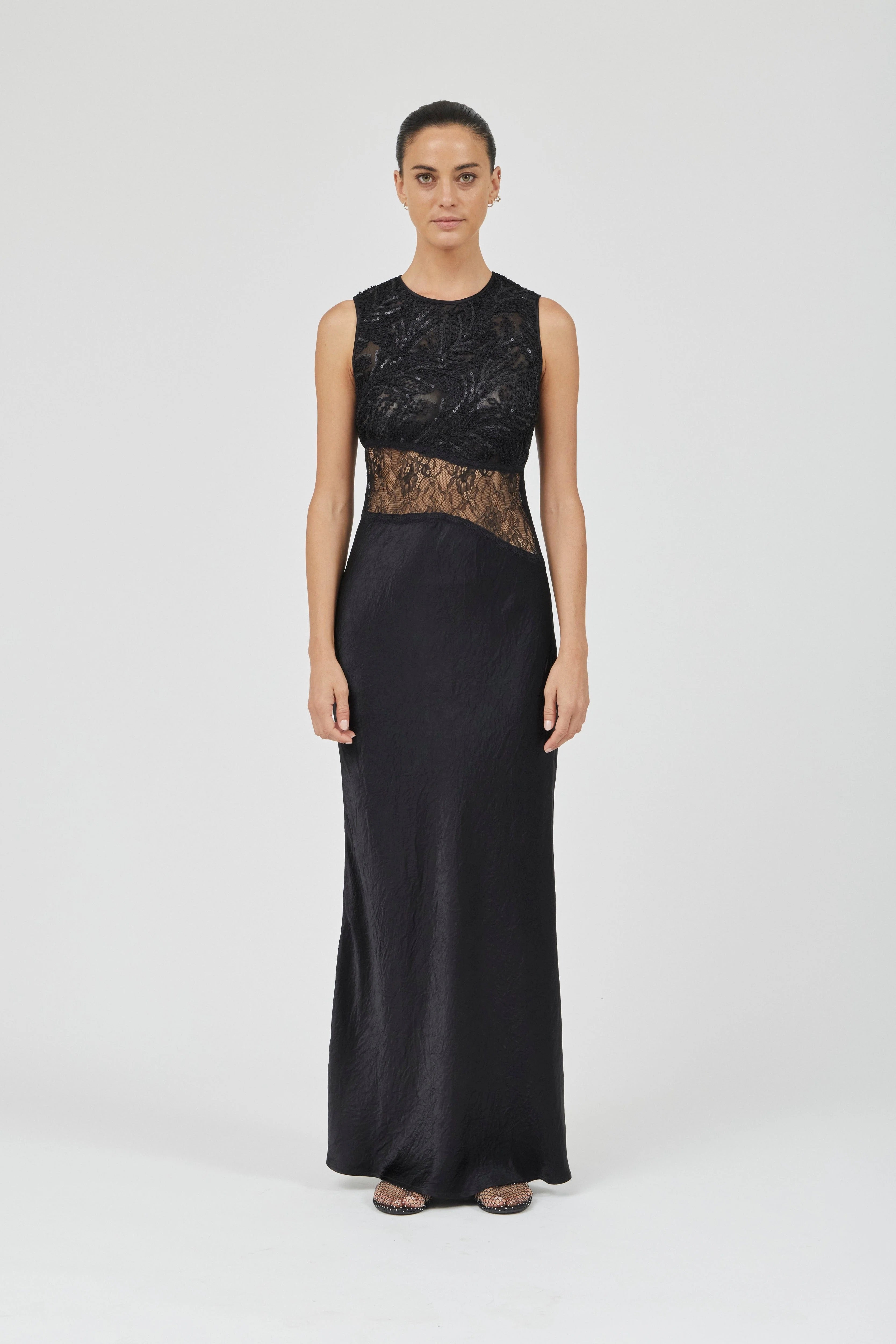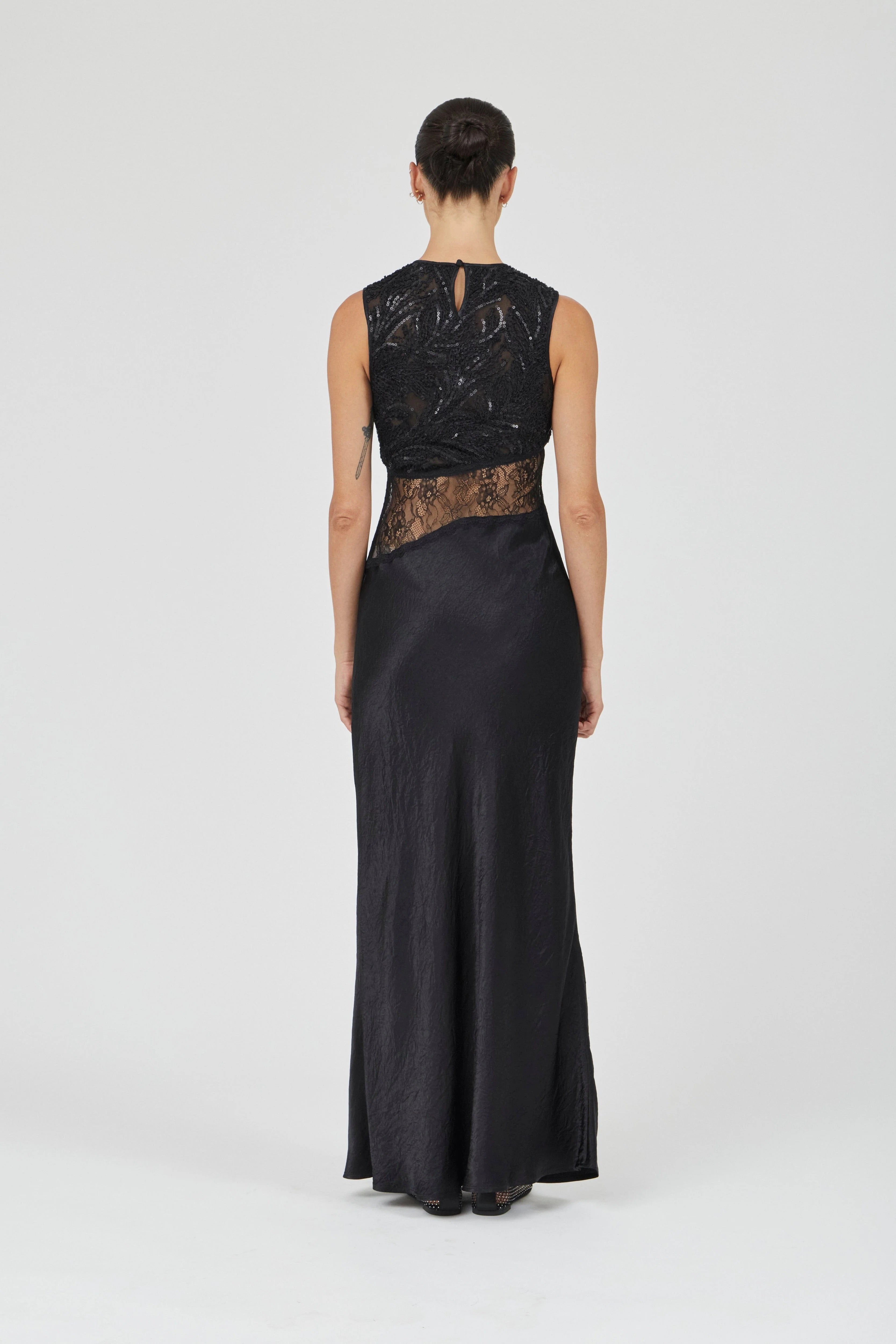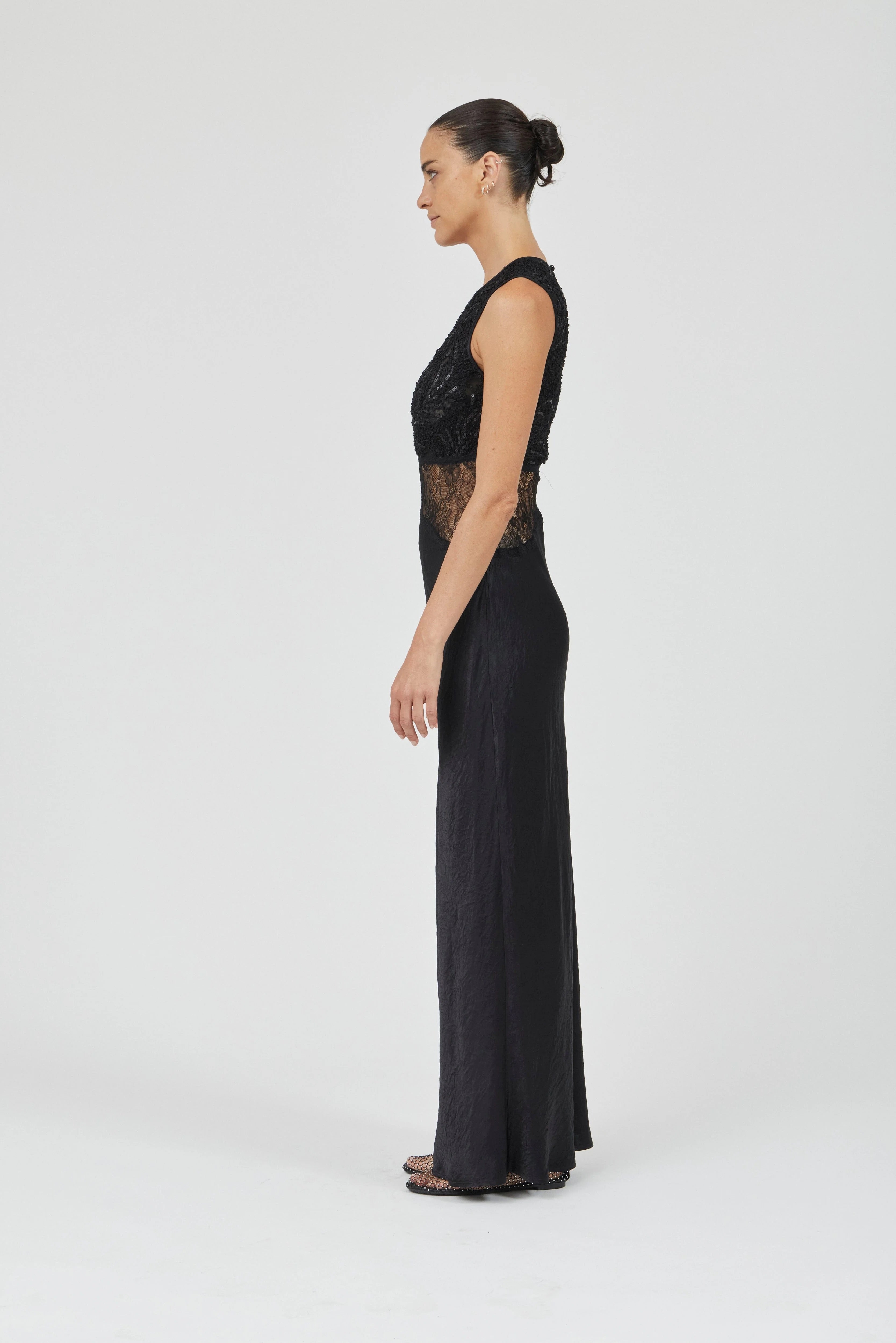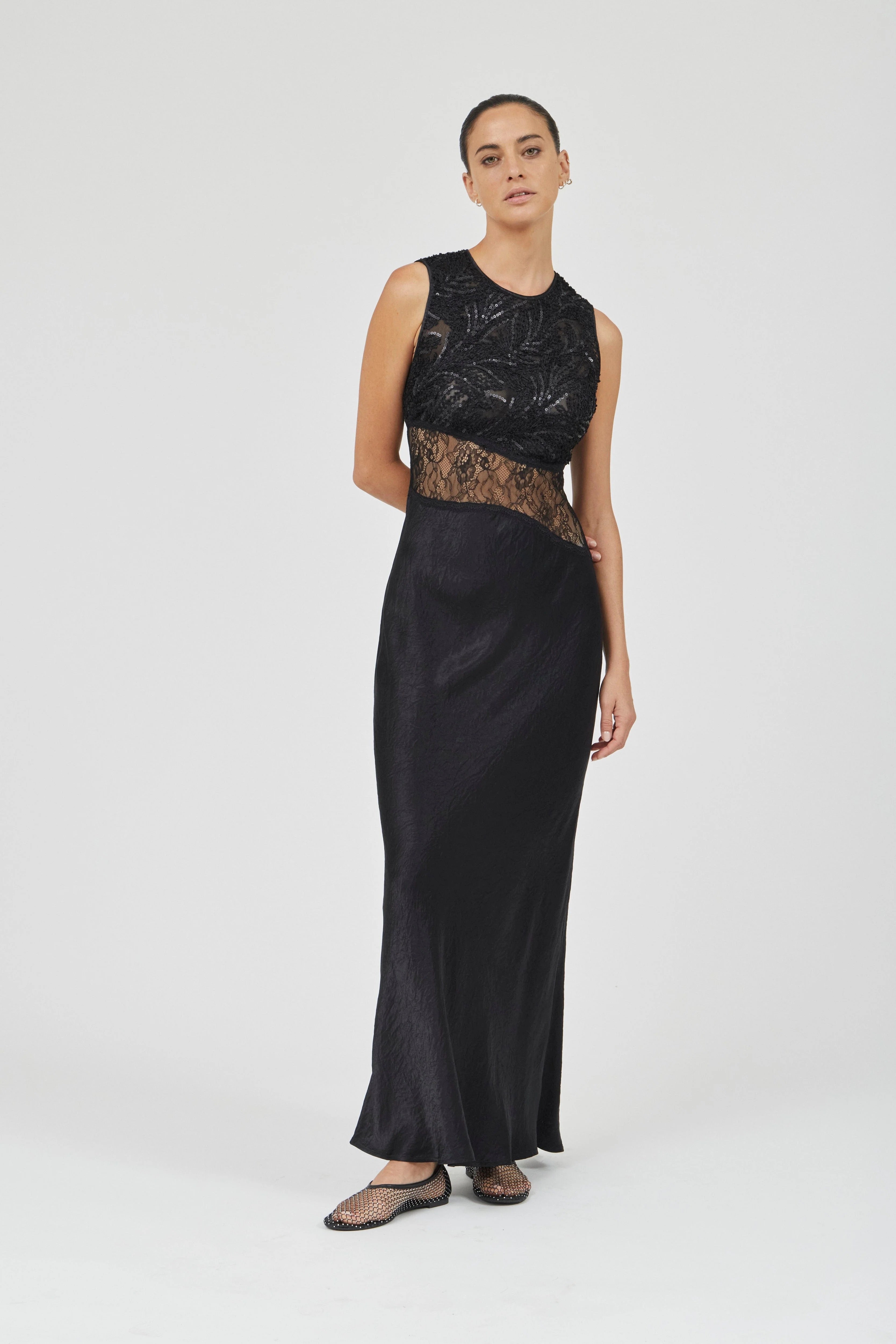 The Twilight Floor Length Dress is defined by it's contrasts in texture and form. A tank style bodice features a captivating sequin and lace panel, while the lower skirt is a bias-cut crushed sustainable fabrication. An outside bind finish at the neckline and armholes adds a clean detail, and a keyhole button closure at the back neck ensures a smooth finish.