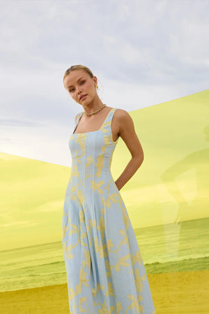 by PASDUCHAS is crafted from a slub linen-cotton blend, featuring an exclusive floral print. Designed with a squared neckline, the silhouette is shaped with linear panel detailing through the bodice and skirt before flaring to a full midi-length hem. Wide straps provide balance and structure, while a centre-back invisible zipper ensures ease of fit. Fully lined for comfort and coverage, this style is an effortless option for warm-weather dressing.