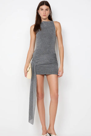 This sparkly mini dress, crafted from an embellished knit fabrication, features a unique draped sash and flattering racer back, ideal for a night out or summer styling.