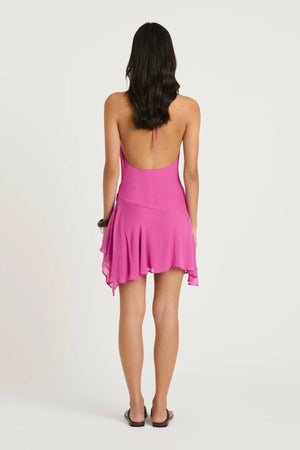 Introducing the Harlow Mini Dress in Fuchsia Pink, a romantic statement piece with a flattering silhouette. Featuring a halter neckline with soft cowl detailing and gentle gathering through the waist, this style drops into a fluid hanky hem skirt for elegant movement. Fully lined for all-day comfort, the Harlow is perfect for weddings, parties, or any special occasion that calls for a bold yet effortless look.