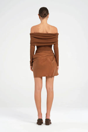 This striking off-shoulder mini features a long-sleeve mesh bodice paired with a flattering cupro skirt. Designed to skim the body, the Luca Mini is defined by an overlapping silhouette with a dramatic cowl detail on the left waist, creating the option to reveal more skin on that side for added edge and dimension.