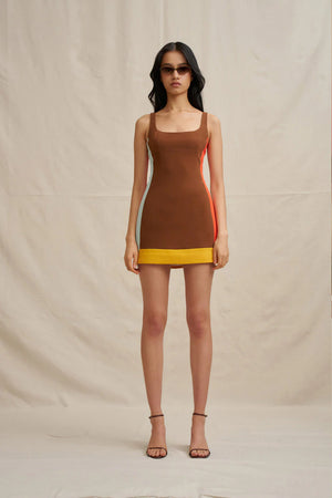 Made from a lightweight stretch crepe, this dress features vibrant multi coloured panels in brown, blue, red and mango. Dress is true to size, with a fitted bodice.