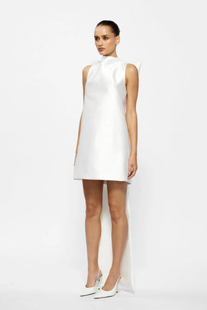 Welcoming the Jorja Mini, an ode to effortless elegance. Our fun and playful take on a mini dress, crafted in a luxurious heavyweight satin for beautiful feel on the body. Detailed with a statement bow at the neckline with a floor length train. Jorja features a sleek and minimal silhouette for a simple yet feminine finishing touch. Detachable bow.