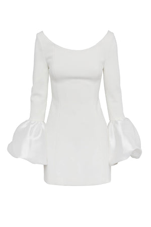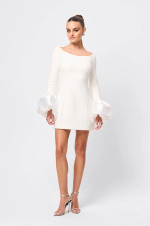 Turn heads in the On My Mind Mini Dress, a refined piece that exudes modern elegance. Made from a luxe stretch crepe knit and fully lined for a smooth fit, this structured silhouette showcases a wide scoop neckline, contoured princess seams, and long sleeves finished with statement Tafetta bell cuffs. Designed to hug the body, it enhances your shape while maintaining a sophisticated edge. Perfect for bridal celebrations or cocktail occasions — just add heels and a sleek clutch.