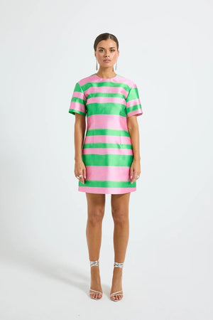 Gigi Sleeve Mini Dress by PASDUCHAS is crafted from lustrous taffeta, featuring an exclusive green and pink stripe print. This form-fitting mini dress showcases a high, rounded neckline and fits through the waist and hips before falling to a mini-length hem. Short sleeves add a modern touch, while a concealed centre-back zipper ensures ease of fit. Fully lined for comfort and structure.
