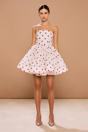 The Nancy Dress is playful yet structured, designed with a fitted bodice and full mini skirt that’s layered with tulle mesh at the hem for added volume. Adjustable straps and a delicate back tie frame the open back, balanced with a concealed zip closure for a seamless finish. Fully lined for comfort.