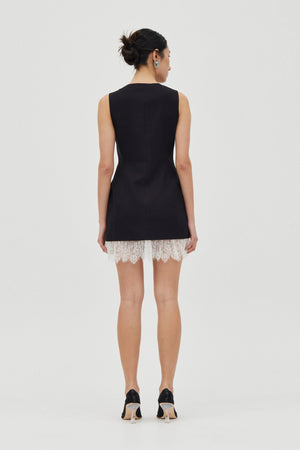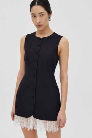 The Nocturne Lace Trim Mini offers a refined take on contemporary tailoring. Defined by a soft round neckline and a tailored fit through the body, it features a centre-front fastening with self-covered buttons. It’s finished with a pleated lace trim hem that introduces contrast and softness.