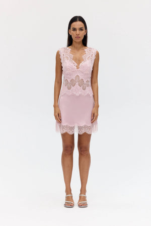 The Visions Lace Mini Dress is crafted from a premium sandwashed Cupro, cut on the bias for a fluid drape and natural movement. Delicate lace traces the bodice, creating a striking interplay of sheerness and texture, while the silhouette falls effortlessly to skim the body.