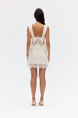 The Visions Lace Mini Dress is crafted from a premium sandwashed Cupro, cut on the bias for a fluid drape and natural movement. Delicate lace traces the bodice, creating a striking interplay of sheerness and texture, while the silhouette falls effortlessly to skim the body.