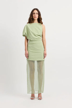 The Suki Two Piece Dress brings a sculptural event look with a soft asymmetric neckline, a fluid batwing sleeve, and gentle tucks that refine the silhouette. The mini dress sits smoothly under a sheer mesh maxi skirt, creating a layered finish that feels modern and versatile. The knot detail at the shoulder adds a considered touch, while the side split gives the mesh skirt subtle movement for warm evenings and elevated occasions.