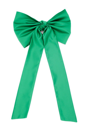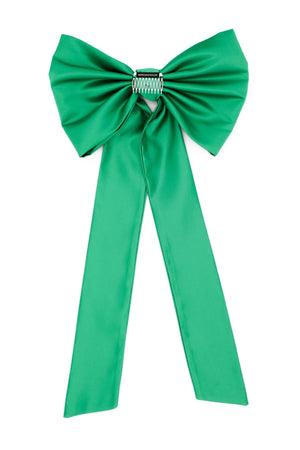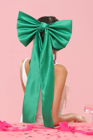 The Morgan & Taylor Carmen Bow in Emerald is a limited piece, made in our small studio in Melbourne. It is a playful and dramatic style, reninicent of classic glamour, thanks to the large satin bow and tails. The bow is easily styled into the hair for many different looks. Includes an attached metal comb for easy styling.