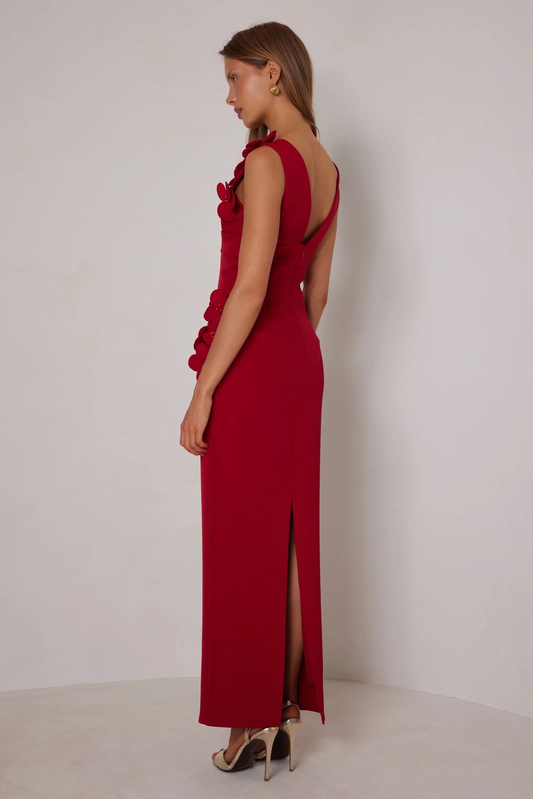The striking Alyana Maxi dress features a deep V neckline and stunning three-dimensional floral appliqués placed on one shoulder and the side of the waist, The thick stretch fabric sits perfectly on the body to maintain a sleek and sophisticated shape. Also available in Pastel Pink.