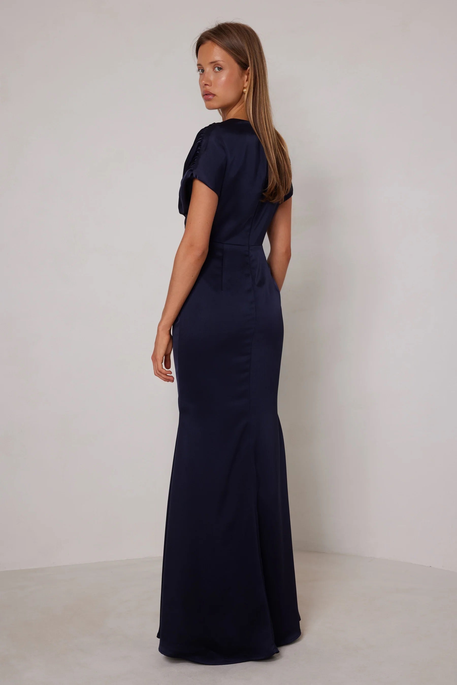 The dress is crafted from satin, featuring a soft, lustrous finish that enhances its elegant appeal. It has a deep V-neckline that gracefully frames the décolletage, complemented by draped short sleeves that add a touch of sophistication.