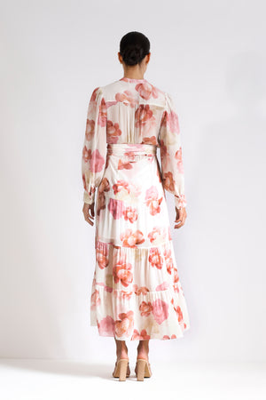 The Memoirs Shirt Midi by PASDUCHAS is crafted from soft viscose chiffon, featuring an exclusive floral print. This classic button-through, tiered shirt midi dress is complete with self-covered buttons along the centre front. It cinches at the waist with a self-tie belt, and the full-length cuffed sleeves bring balance to the look. Fully lined through the body, offering comfortable coverage.