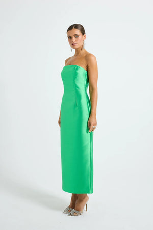 by PASDUCHAS is crafted from lustrous taffeta. This statement piece features a clean, strapless neckline and a fitted bodice, internally supported with boning. Designed to flatter, the silhouette skims the body and falls to a midi-length hem. A centre-back split adds ease of movement, while a concealed centre-back zipper ensures comfort and ease of fit. Fully lined throughout, this is an elevated option for modern event dressing.