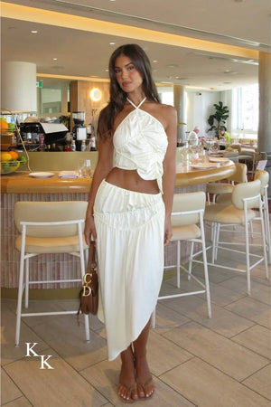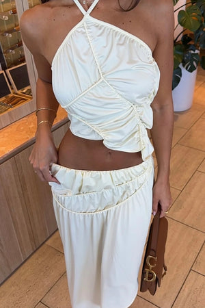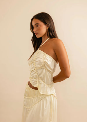 Sculpted and sensual, meet the Fleur Top by Koster Kulture designed to flatter with bold abstract hand-tacked piping details. Crafted in a soft butter yellow from a recycled poly-elastane blend, it offers a gentle stretch that flatters the body with movement. An off-centre halter neckline ties delicately at the neck with adjustable thin straps. Finished with an asymmetrical hem that blends vintage glamour into a modern twist.