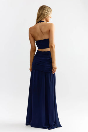 The Andre Set is a contemporary expression of elegance and ease. The halter-style crop top is ruched for a flattering, sculpted fit, while the georgette maxi skirt features a gathered panel at the waist that flows into a dramatic front sash. Designed to elongate the silhouette with soft draping and fluid movement, this set strikes the perfect balance between modern sophistication and timeless allure.