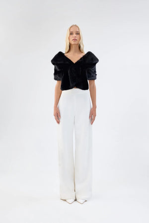 THE CHAMPAGNE WRAP ADDS TIMELESS AND ETHICAL STYLE TO THE CELEBRATION WITH ULTRA-SOFT SHORT LENGTH FAUX FUR AND A COZY OVERSIZED FIT AROUND THE SHOULDERS AND ARMS.