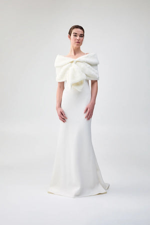 THE CHAMPAGNE WRAP ADDS TIMELESS AND ETHICAL STYLE TO THE CELEBRATION WITH ULTRA-SOFT SHORT LENGTH FAUX FUR AND A COZY OVERSIZED FIT AROUND THE SHOULDERS AND ARMS.