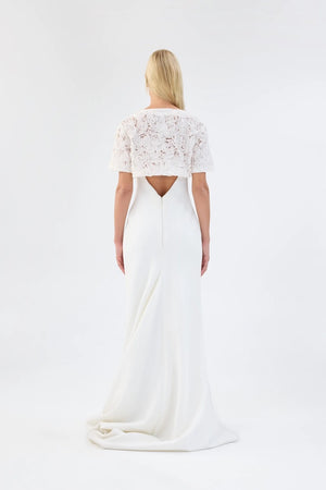 The Rosa Bolero brings ethereal elegance to bridal styling. Sheer floral tulle appliqué fabric creates a delicate, lightweight texture. A cropped silhouette and round neckline frame the design, while a single vegan fabric covered hook and eye closure secures the piece at the center front. Its unlined construction and subtle stretch ensure comfort throughout wear.