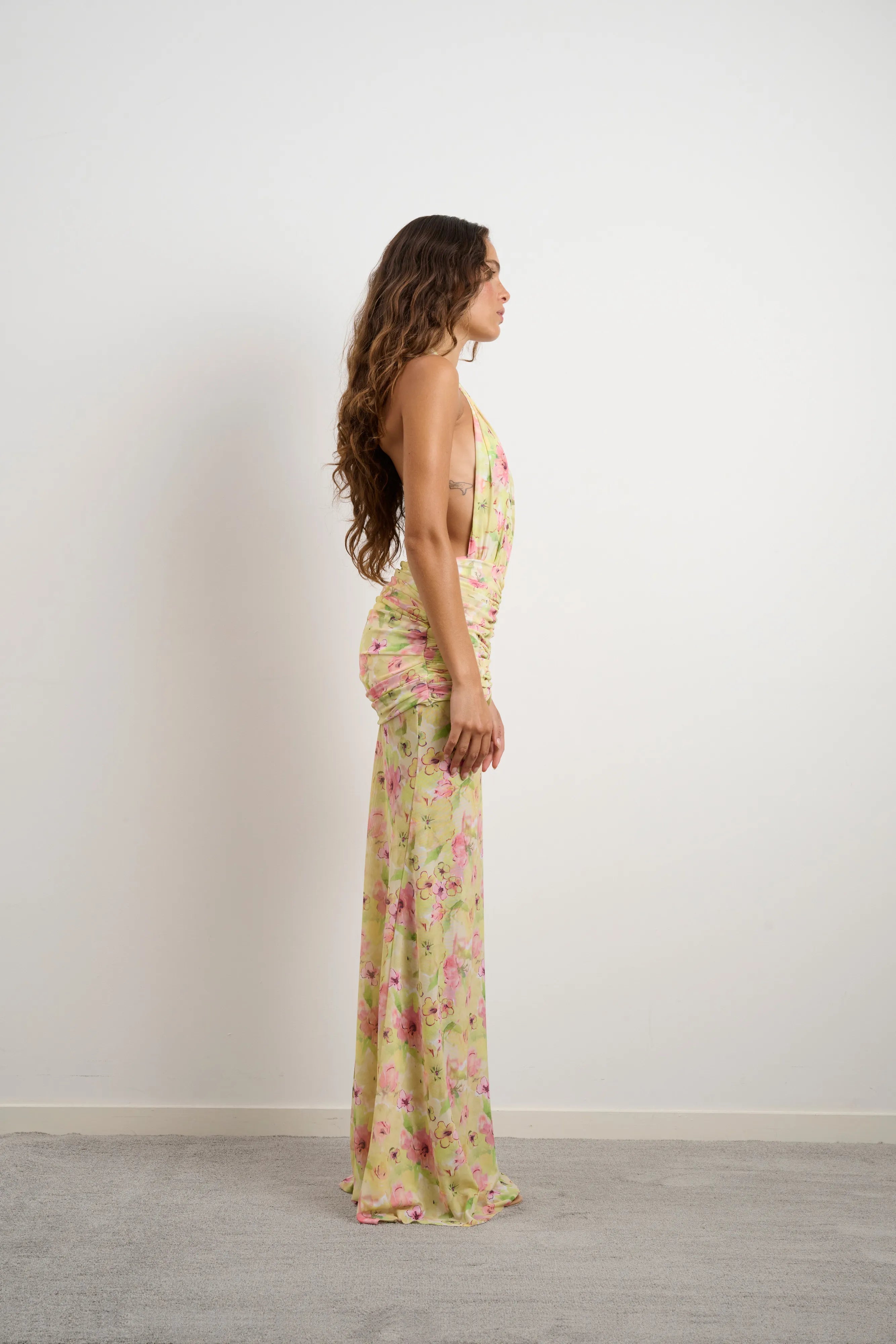 Introducing the Solene Dress by DŻO — a flirty halter maxi designed in a fresh spring floral. Its plunging neckline and gathered waist sculpt the silhouette while keeping the vibe soft and romantic.