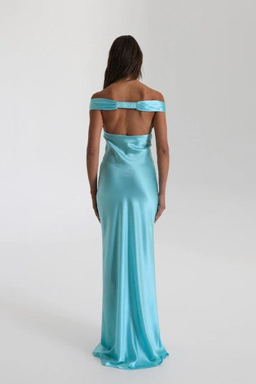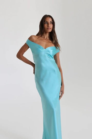 Introducing the Natalie Rolt Bridget Gown. This off-shoulder silk gown is designed to elegantly highlight the décolletage, with a sophisticated elasticated back feature that adds both style and comfort. Crafted from luxurious, lightweight silk, this gown is perfect for any formal occasion, offering both breathability and elegance.