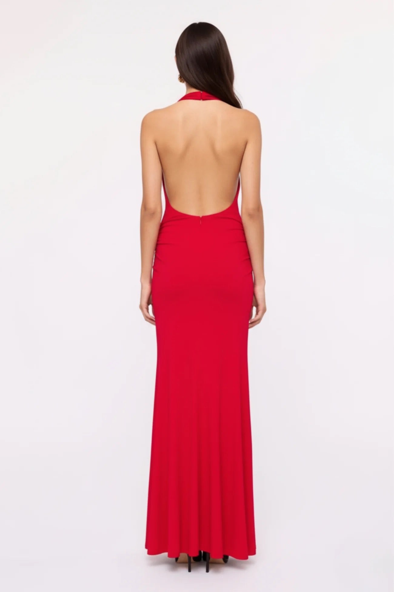 The Ruby Slinky Jersey Halter Maxi Dress – Cherry Red captures modern glamour with an effortless, fluid drape. Crafted from lustrous slinky jersey that skims the body, it features a deep halter neckline with adjustable ties and an open back that balances allure and sophistication. The floor-length silhouette elongates the frame, while the soft stretch fabrication moves beautifully with you. Perfect for weddings, evening events, and resort soirées, it’s a timeless statement in rich cherry red.