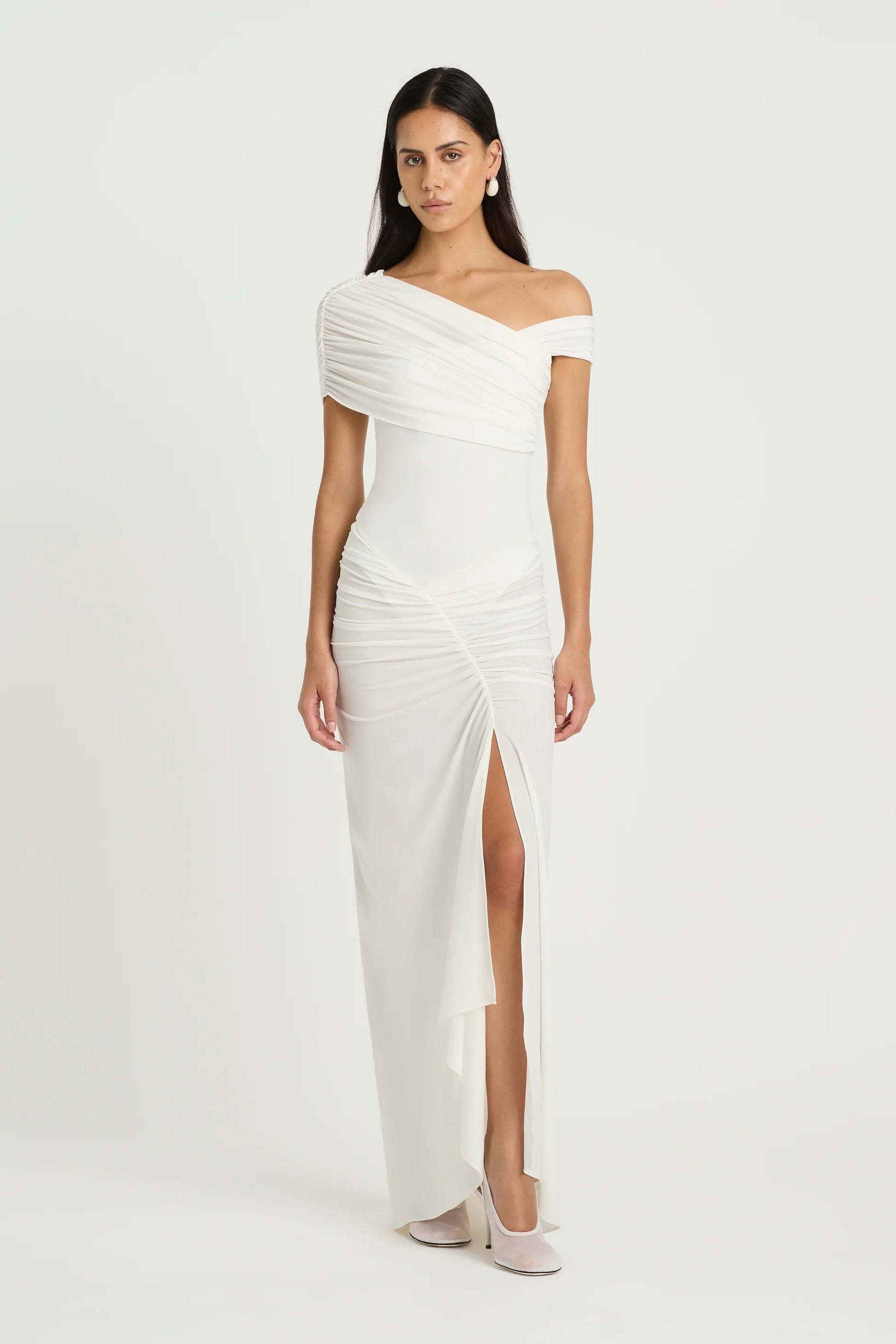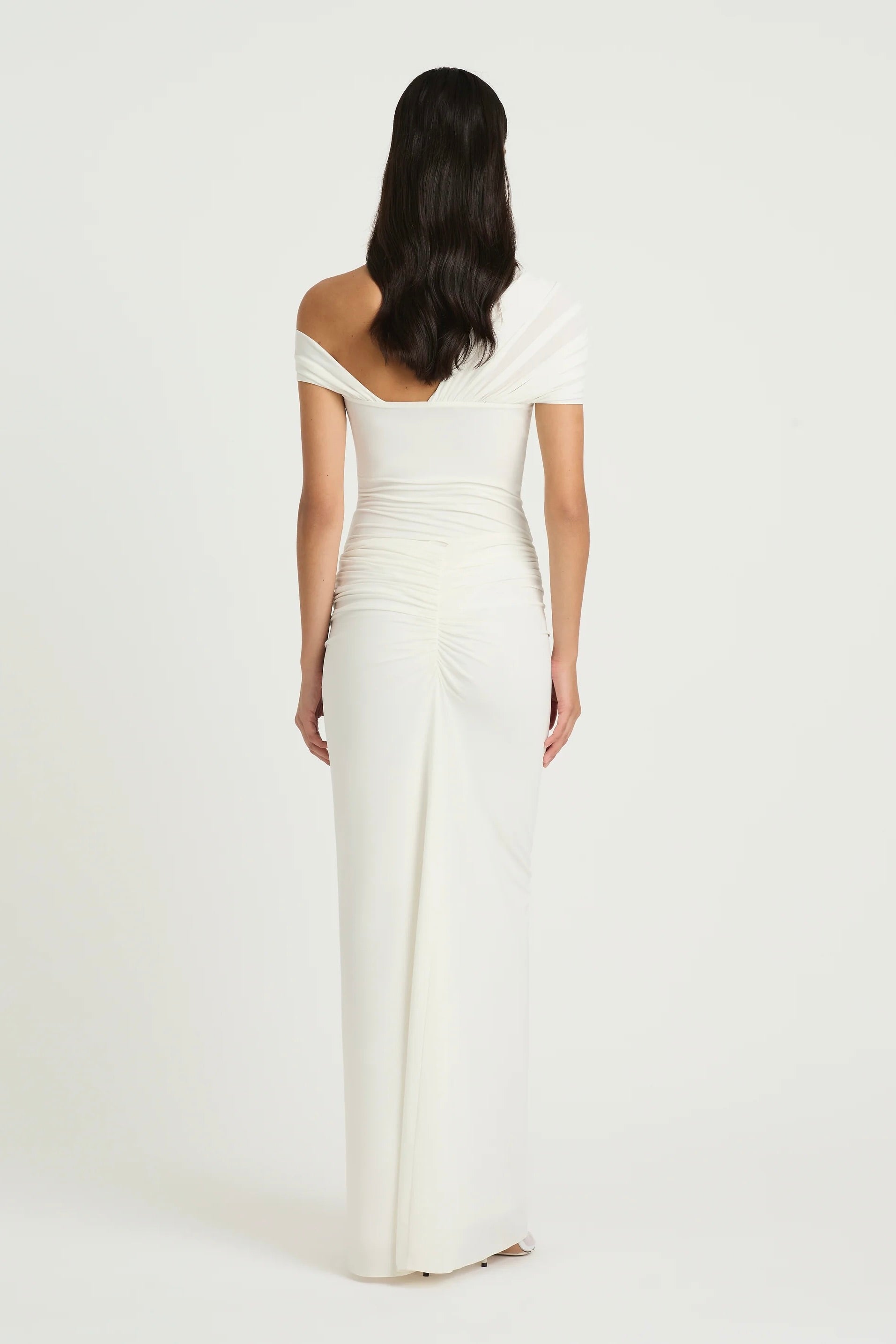 The Rumi Maxi Dress features an asymmetric one-shoulder neckline crafted from stretchy jersey fabric. The skirt follows an asymmetric design with a curved gathered detail and a front leg opening for movement. The skirt also features a detachable lining for solid or sheer option.