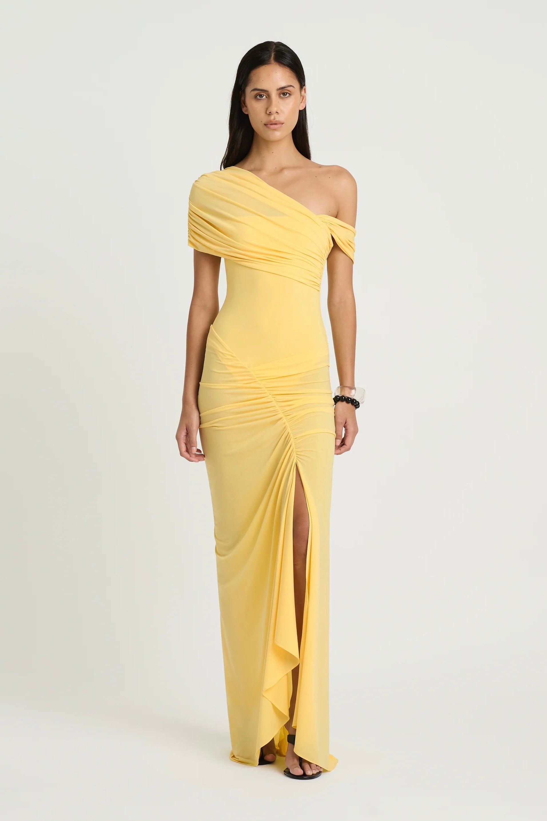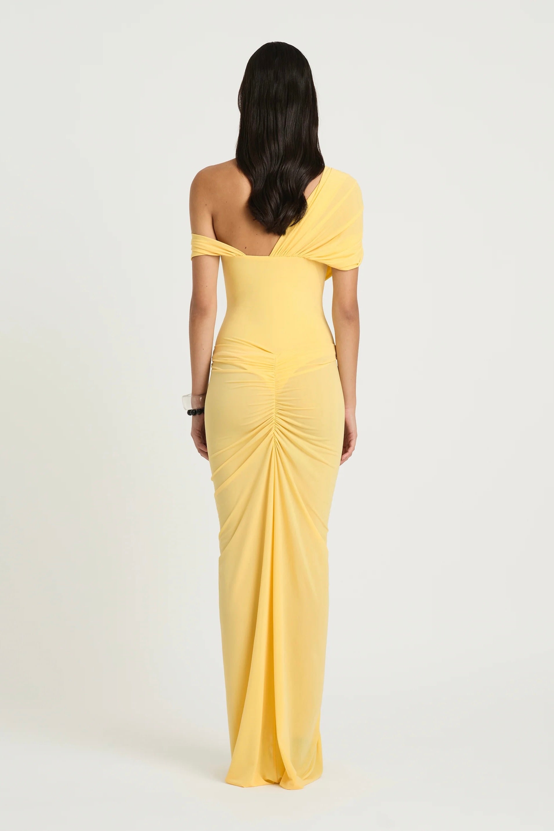 The Rumi Maxi Dress features an asymmetric one-shoulder neckline crafted from stretchy jersey fabric. The skirt follows an asymmetric design with a curved gathered detail and a front leg opening for movement. The skirt also features a detachable lining for solid or sheer option.