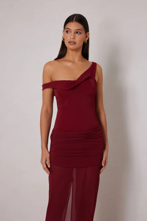 The Gizelle gown features an asymmetrical neckline, underwiring cupping and sheer skirt overlay. This dress offers a blend of modern style with ethereal beauty.