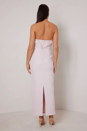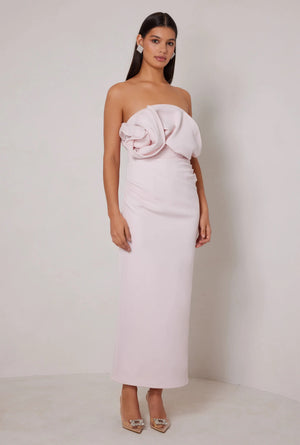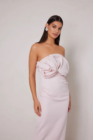 The Miles dress is an elegant, floor-length gown features a showstopping 3D effect, creating an oversized sculptural feature which is meticulously created using wire, adding sophistication and drama. The dress also features a fitted silhouette complimented by gathering along the body for a flattering look.