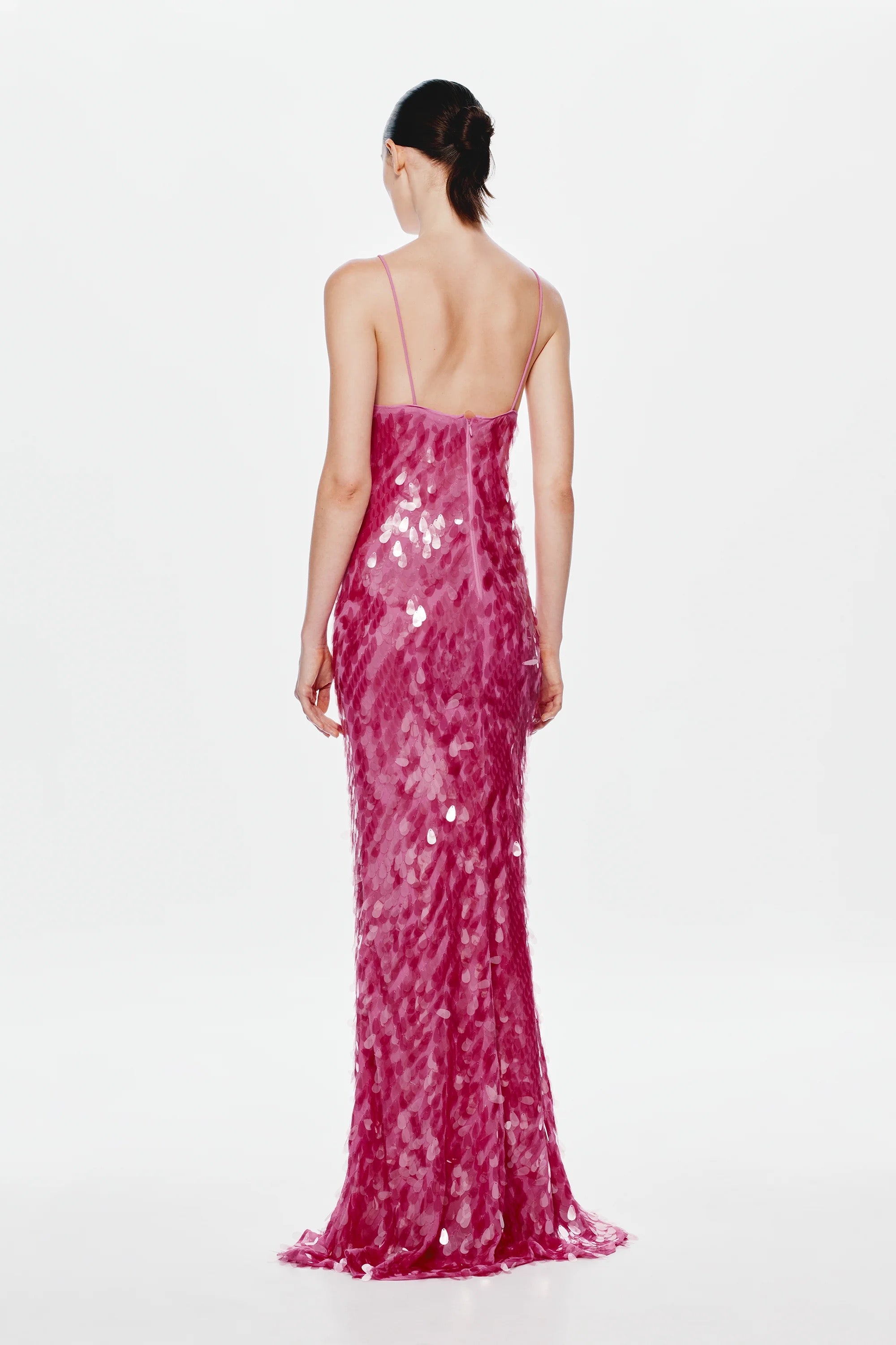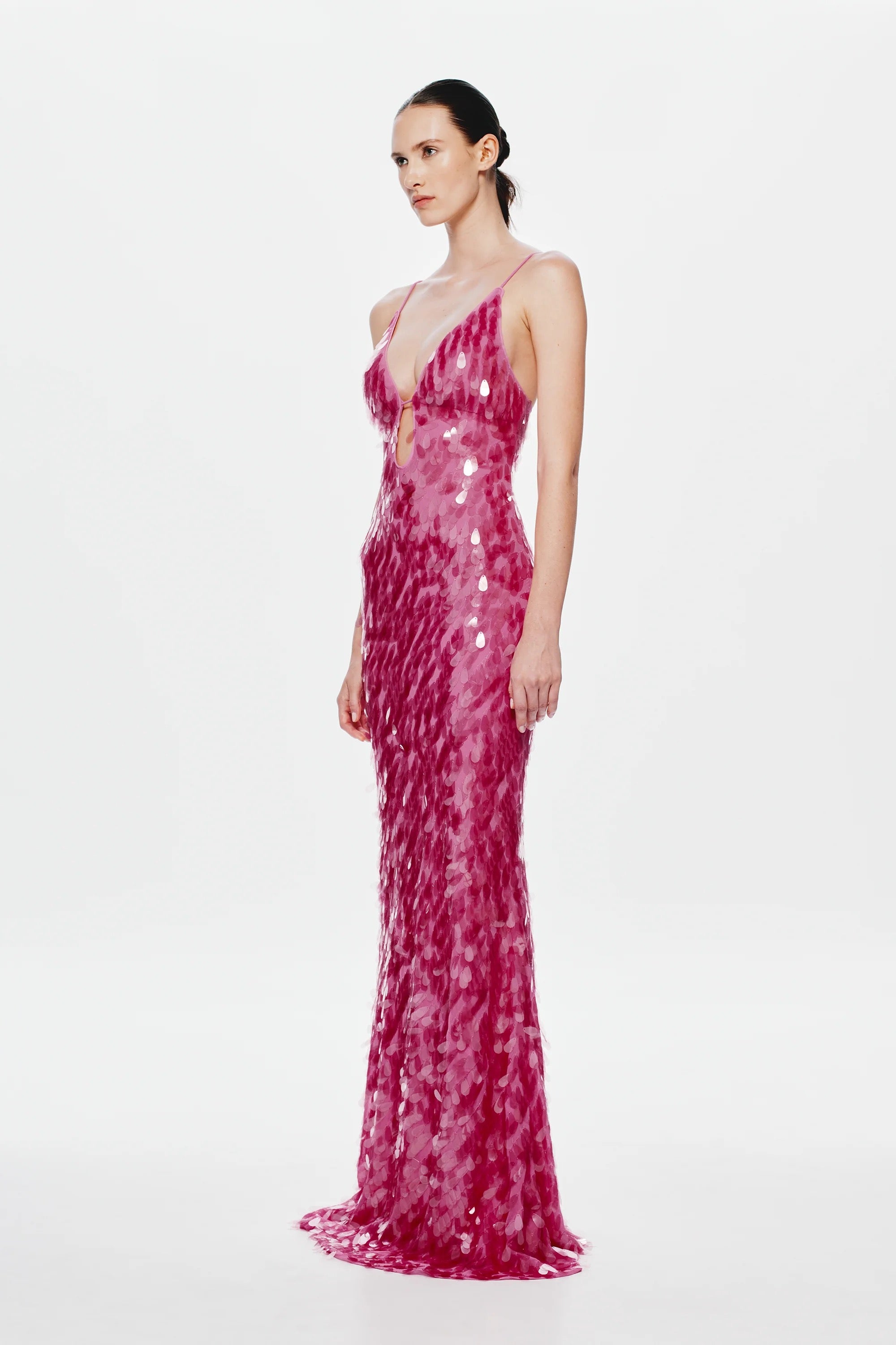 She is elegant with her maxi silhouette, yet has a fun sensibility through her bold colour. Each sequin catches the light- emulating the soft movements of water. Sapphire is also daring with her plunging neckline and low-back. Style her with a strappy heeled sandal to finish the look.