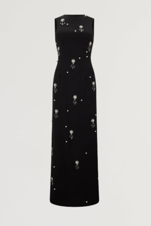 - Features: Hand-applied crystals and pearls, maxi length, no stretch