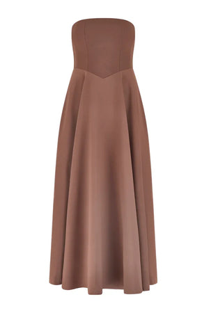 This fall, we've reimagined our iconic square neck midi into a stunning strapless silhouette in a rich chocolate hue. Designed with a flattering V-shaped waistline and boning for a structured, elevated fit, this dress embodies timeless elegance.
