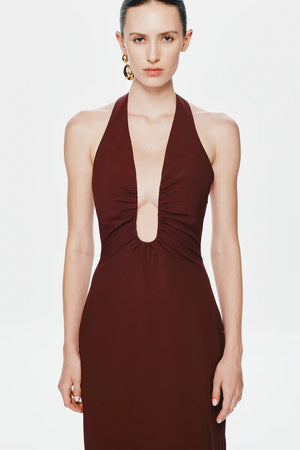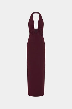 The 'Alusia' Stretch Twill Maxi Dress in Port, minimalistic in design.