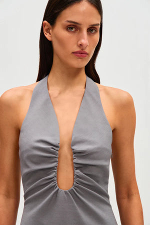 The Alusia Twill Mini Dress features a minimalistic design that highlights a sculptural neckline, beautifully framing the bust. This dress is an ideal transseasonal piece that can effortlessly transition from day to night, styled with either boots or heeled sandals.