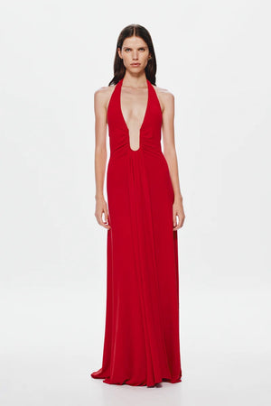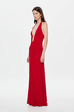 This new signature for the brand is innovative, with its plunging halter neckline that is finished with an adjustable wire and waterfall sash detailing. Jennifer pushes the boundaries with her long clean lines that expose the wearers cleavage ever so subtly.